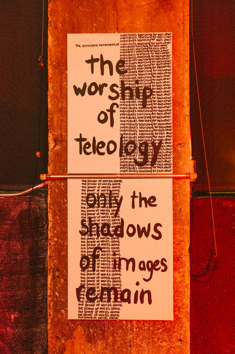 A solo gallery show accompanied the performance which featured both hung and wall paintings with text from the performance alongside the critical theory texts that inspired the work.